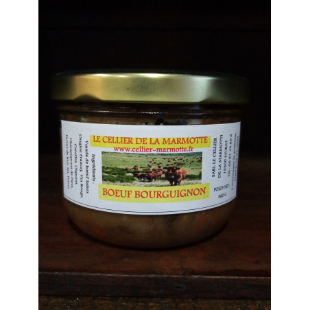 Ingrédients : Viande de boeuf salers (Origine France), vin rouge, carottes, oignons, champignons de Paris, farine de BLÉ, sel, poivre.